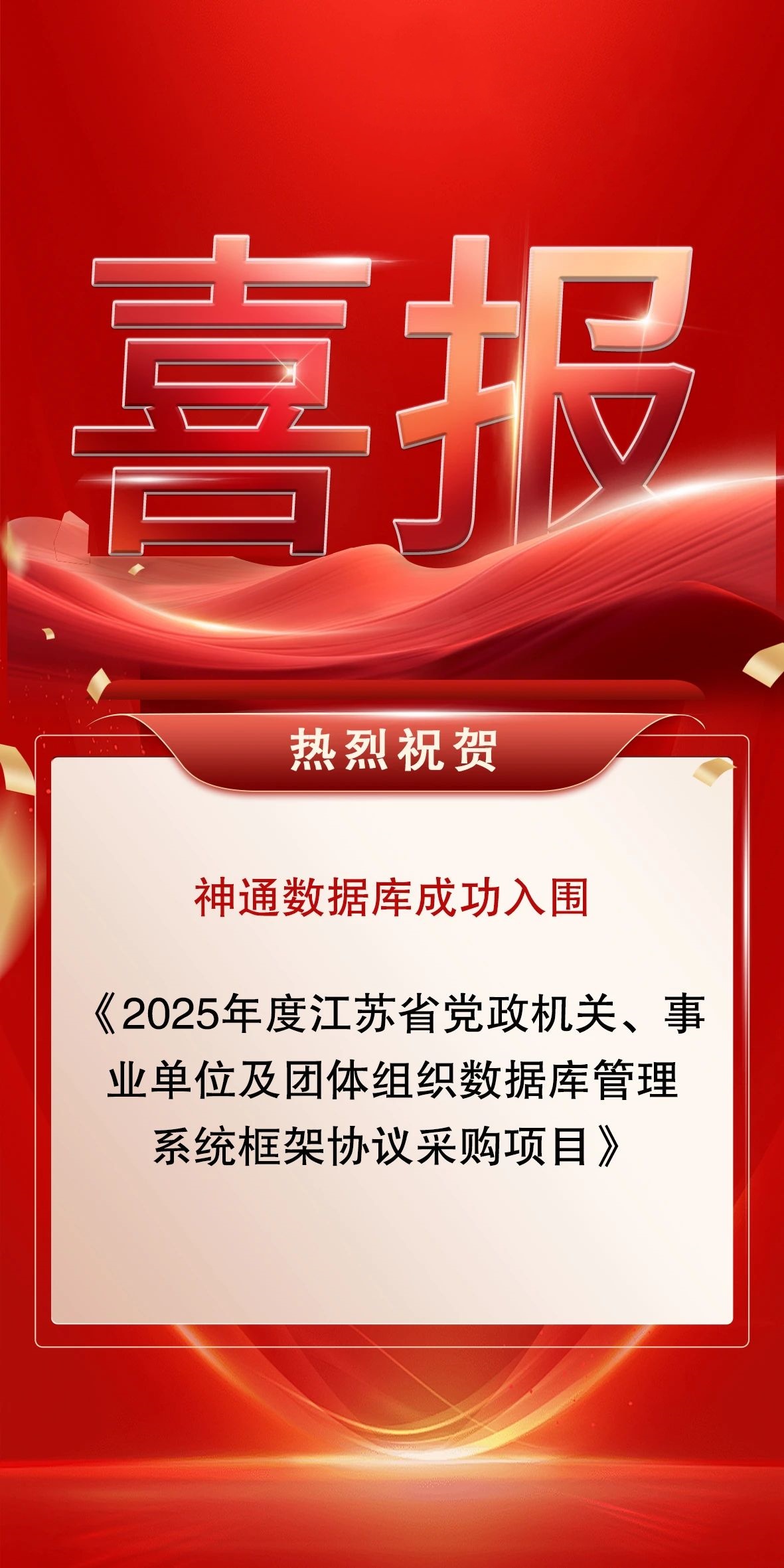 喜訊 神通數據庫入圍2025年度江蘇省黨政機關、事業單位及團體組織數據庫管理系統框架協議采購項目